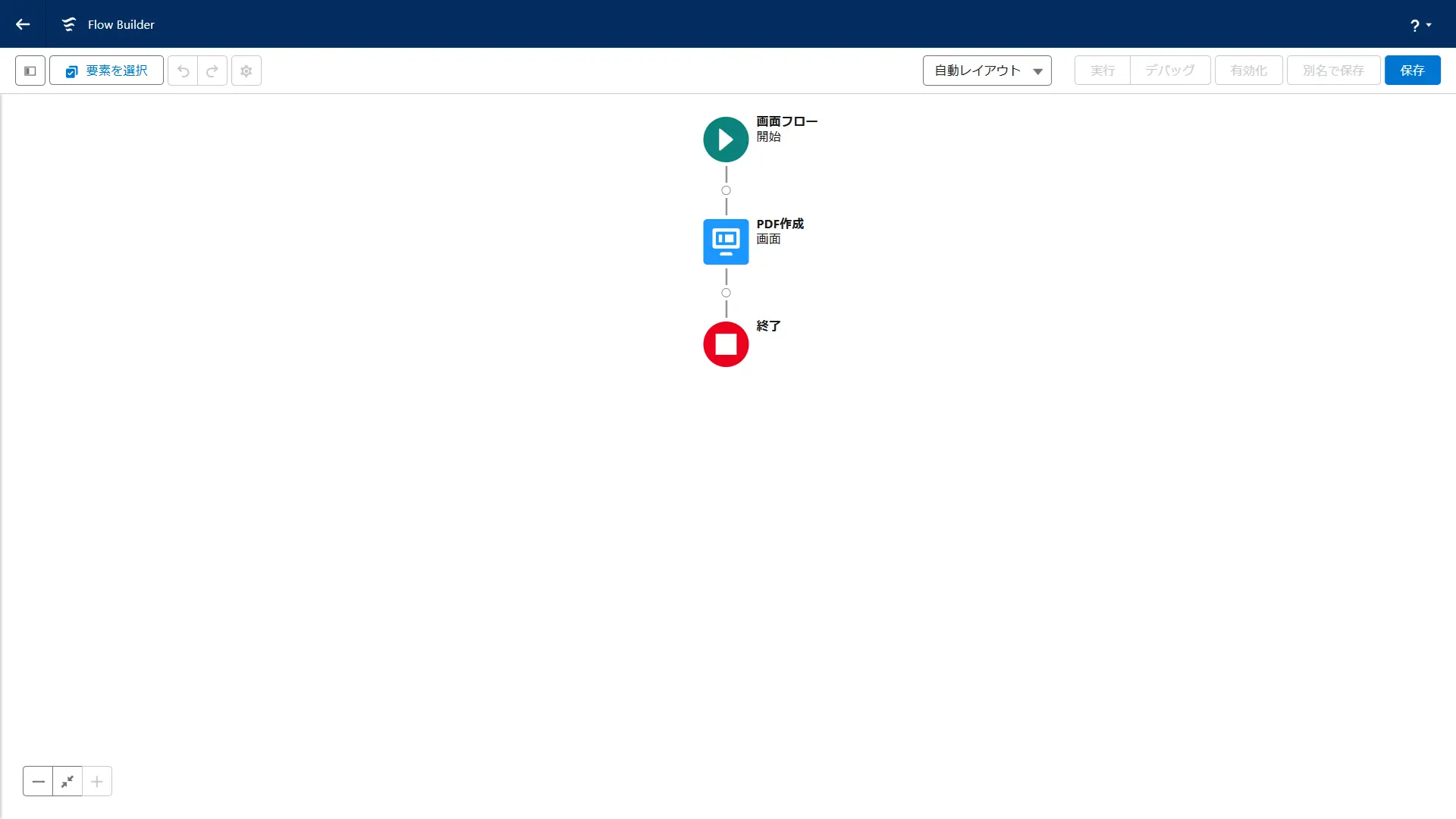サンプルで、商談から請求書 PDF を生成するフローを一つ作成してみます。フローの新規作成から画面フローを選択し、以下の画面キャプチャのように「PDF 作成」という画面を配置します。