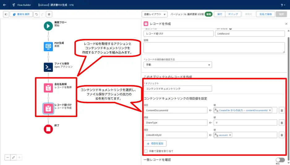 「LGF_FileRegisterAction」は保存したファイルのコンテンツバージョン ID やコンテンツドキュメント ID を出力できます。